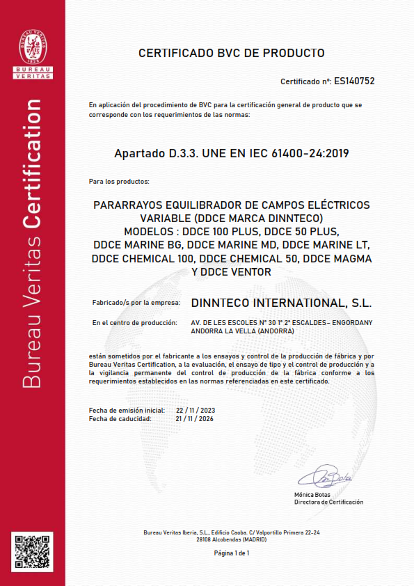 Producto certificado como Sistema de Protección Contra el Rayo por BUREAU VERITAS Certificación (Número. ES140752):